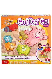 The outrageous pig stacking wolf doding board game Every game is a new adventure as the piggies race for the finish Slow down your opponent by shooting the tractor's hay bales and sending your opponent back to his mudpi Strategy and making choices keeps the game challenging and different every time you play Includes 1 game board, 12 piggies, a wolf in his tractor, 3 hay bales and a die